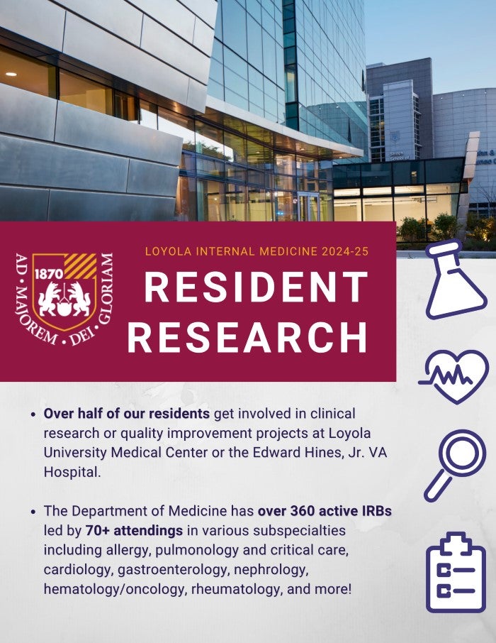 Loyola Medicine's Internal Medicine Department is committed to supporting a robust research experience during your residency training. Our program supports resident research through opportunities for dedicated research time, mentorship, funding, a resident research day and meaningful educational experiences.